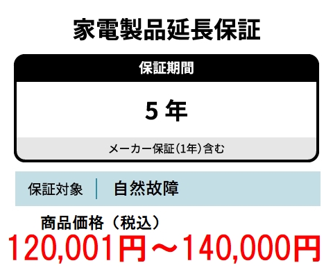 ワランティテクノロジー 5年間延長保証(自然故障対象)商品価格120,001円~140,000円