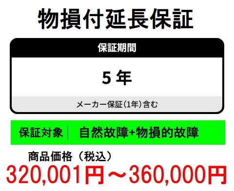 ワランティテクノロジー 5年間延長保証(自然故障+物損的故障対象)商品価格320,001円~360,000円
