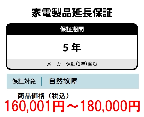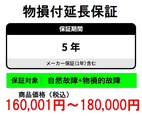 ワランティテクノロジー 5年間延長保証(自然故障+物損的故障対象)商品価格160,001円~180,000円