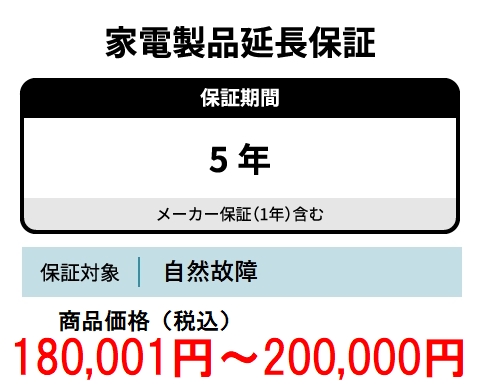 ワランティテクノロジー 5年間延長保証(自然故障+物損的故障対象)商品価格180,001円~200,000円