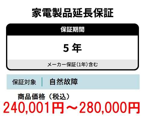 ワランティテクノロジー 5年間延長保証(自然故障+物損的故障対象)商品価格240,001円~280,000円