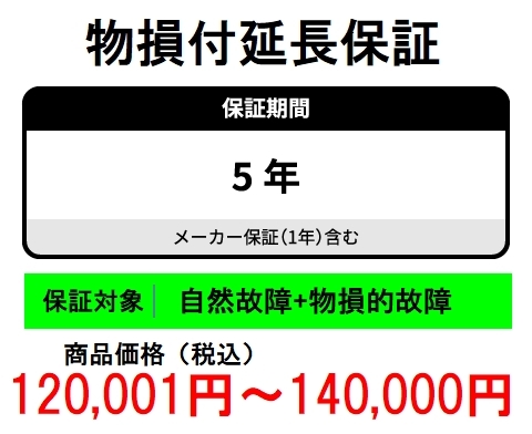 ワランティテクノロジー 5年間延長保証(自然故障+物損的故障対象)商品価格120,001円~140,000円